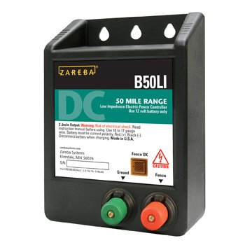The Zareba Battery Operated Low Impedance Fence Controller is ideal for use with all live stock animals including cows, sheep, goats, horses, and pigs 50 mile range; heavy, wet weed conditions For optimal performance use 12 volt deep-cycle battery (not included) Rugged, weather-resistant cabinets with digital timing and fuseless design Delivers safe, effective high voltage shocks to deter all type